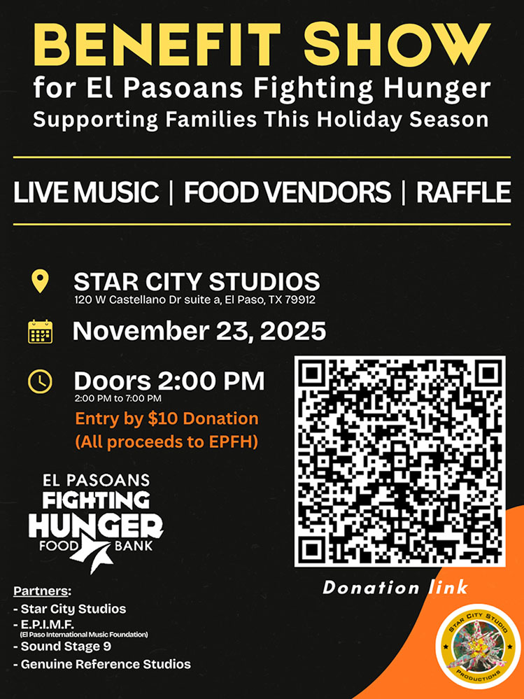 To combat hunbger in our region, Star City Studios is throwing a benefit show for El Pasoans Fighting Hunger on November 23rd, starting at 2pm. All proceeds will go to the food bank, and the show will be accompanied by food vendors and a raffle. We hope to see you there!